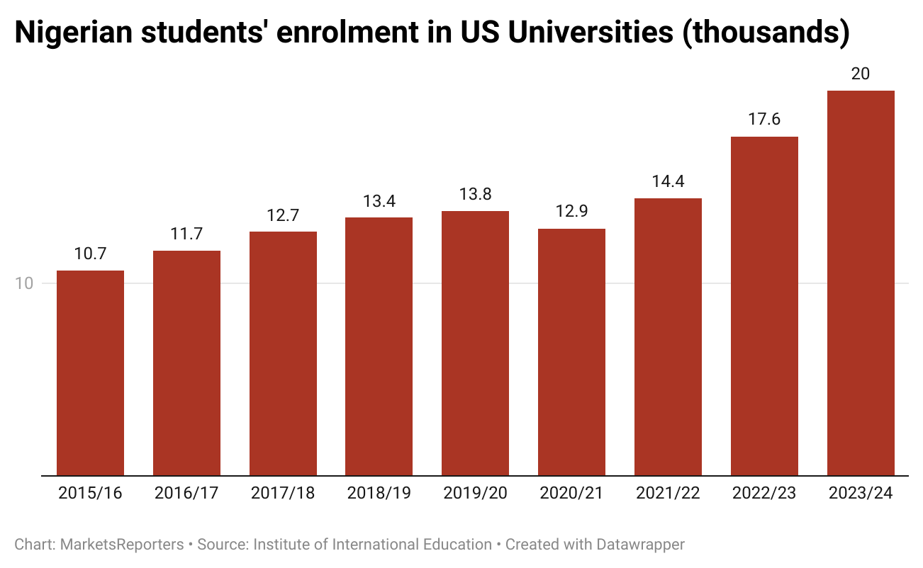 The number of Nigerian students at US colleges and universities rose by 13.5 percent to 20,029 in the 2023/24 academic year, compared to an increase of 22.2 percent in the previous year, according to Markets Reporters’ analysis of the latest data from the Washington-based Institute of International Education.